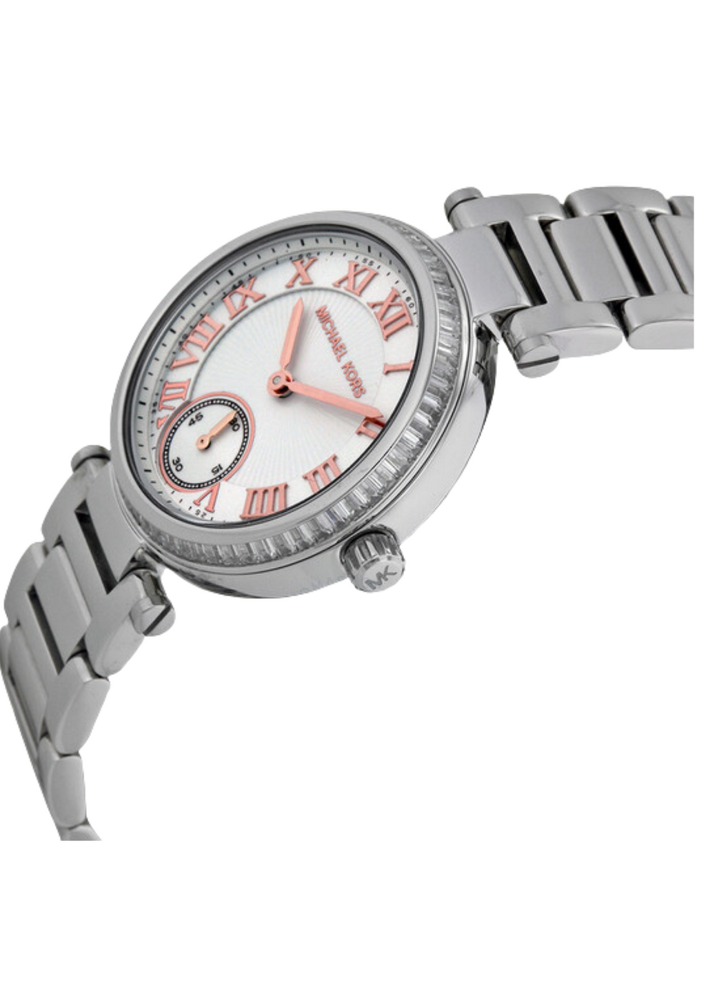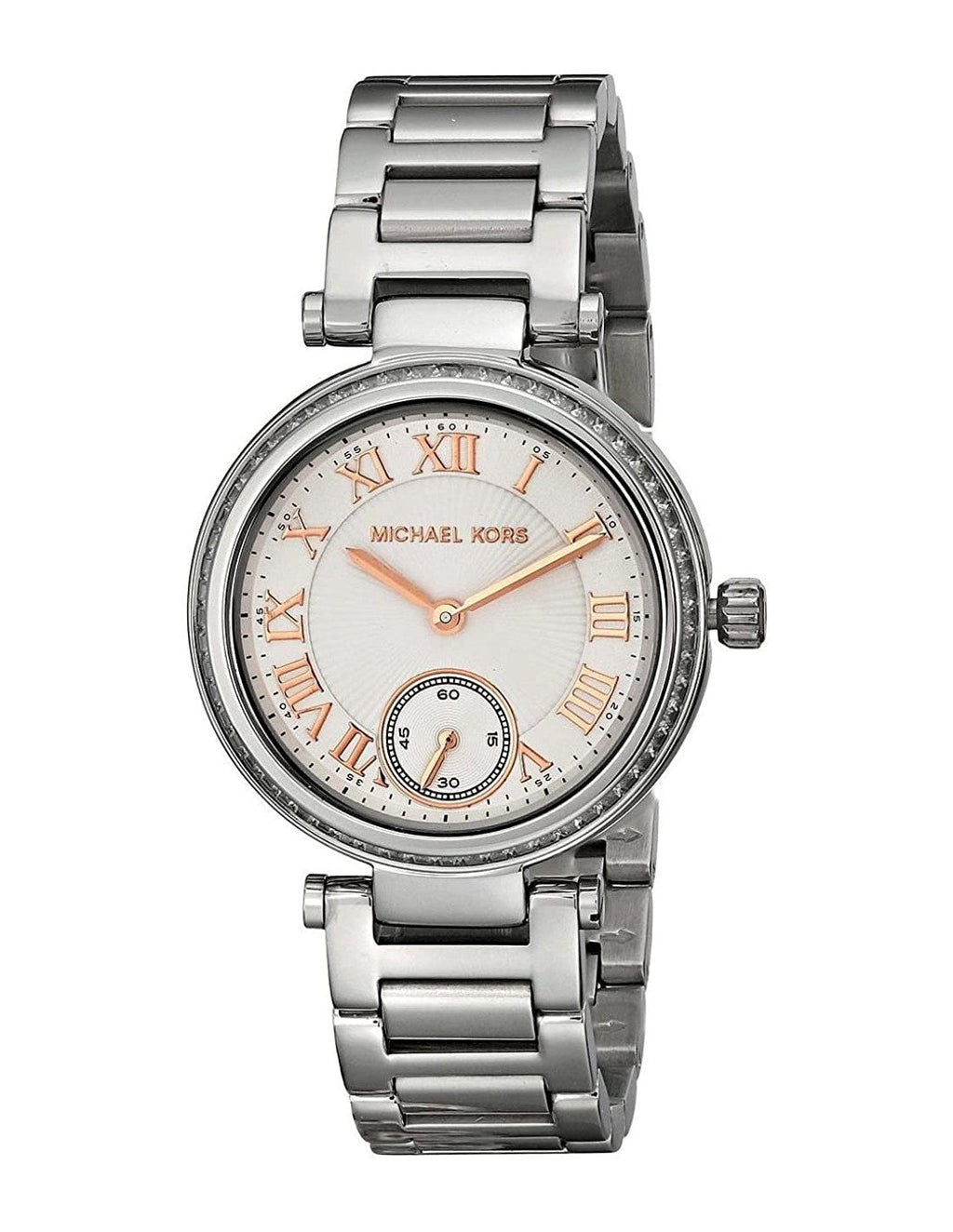 علبة وسوار من الفولاذ المقاوم للصدأ. إطار ثابت من الفولاذ المقاوم للصدأ مرصع بكريستالات باغيت. مينا فضي مع عقارب مطلية بالذهب الوردي وعلامات ساعات بأرقام رومانية. علامات دقائق حول الحافة الخارجية. نوع المينا: تناظري. مينا فرعي للثواني عند موضع الساعة 6. حركة كوارتز. زجاج معدني مقاوم للخدش. تاج سحب/دفع. غطاء خلفي صلب. قطر العلبة: 33 مم. شكل العلبة: دائري. عرض السوار: 16 مم. مشبك قابل للطي. مقاومة للماء حتى عمق 50 مترًا/165 قدمًا. الوظائف: الساعات، الدقائق، الثواني. تصميم ساعة كاجوال. ساعة مايكل كورس سكايلر النسائية MK5970، مينا فضي، فولاذ مقاوم للصدأ.