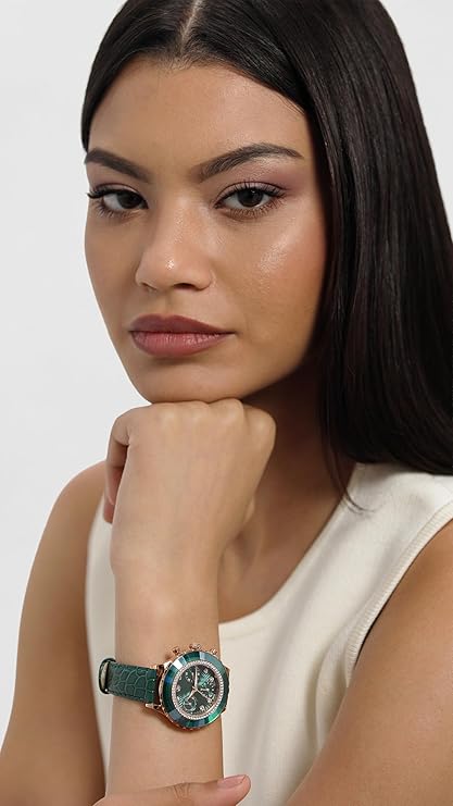 ساعة سواروفسكي 5672931 أوكتيا كرونو هي ساعة كرونوغراف كوارتز، تتميز بعلبة دائرية من الفولاذ المقاوم للصدأ بلون الذهب الوردي بقطر 37 مم، وميناء أخضر. وهي مزودة بسوار ومشبك من الجلد الأخضر.