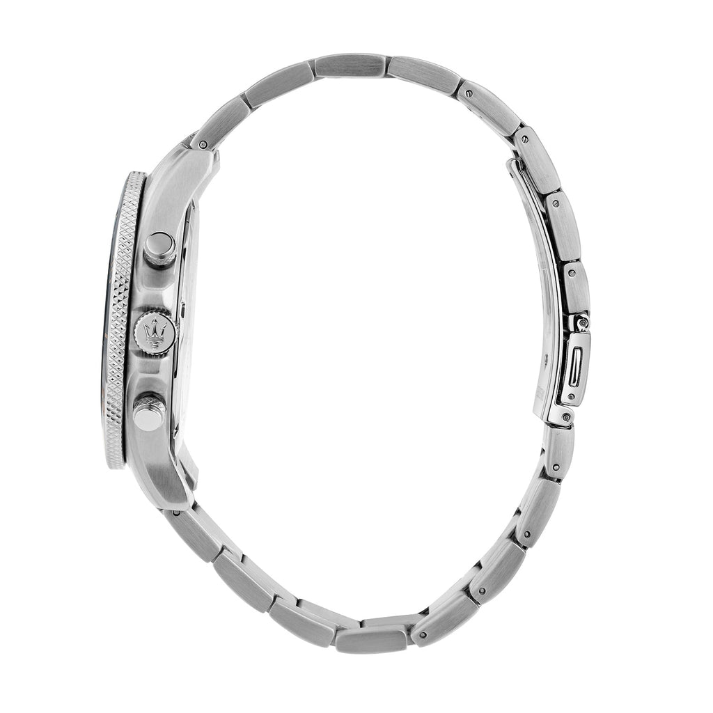 ساعة مازيراتي R8873600003 كومبيتزيوني دايفر للرجال، تتميز بعلبة دائرية من الفولاذ المقاوم للصدأ الفضي بقطر 43 مم، وميناء أسود، وسوار فضي. تعمل الساعة بحركة كوارتز.