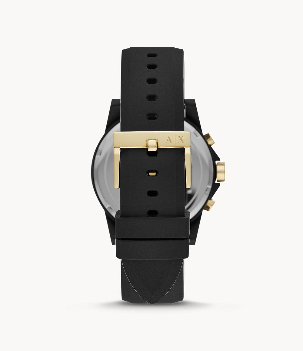 Black-plated stainless steel case with a black silicone strap. Fixed black-plated bezel. Black dial with gold-tone hands and index hour markers. Arabic numeral minute markers (at 5 minute intervals). Minute markers around the outer rim. Dial Type: Analog. Date display between the 4 and 5 o'clock positions. Chronograph - three sub-dials displaying: 60 second, 30 minute and 24 hour. Quartz movement. Scratch resistant mineral crystal. Solid case back. Round case shape. Case size: 45 mm. Band width: 22 mm. Tang clasp. Water resistant at 50 meters / 165 feet. Functions: chronograph, date, hour, minute, second. Additional Info: comes with a coordinating luggage tag. Casual watch style. Armani Exchange Chronograph Quartz Black Dial Men's Watch.