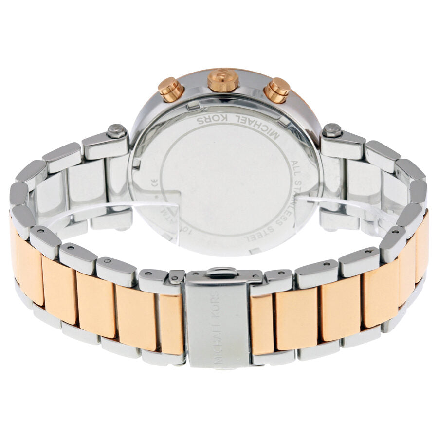 Rose gold-tone stainless steel case with a two-tone (silver and rose gold-tone) stainless steel bracelet. Fixed rose gold-tone bezel set with crystals. Blue dial with luminous rose gold-tone hands and crystal index hour markers. An Arabic numeral marks the 12 o'clock position. Minute markers around the outer rim. Dial Type: Analog. Date display between 4 and 5 o'clock positions. Chronograph - three sub-dials displaying: 60 second, 30 minute and 24 hour. Quartz movement. Scratch resistant mineral crystal. Pull / push crown. Solid case back. Case diameter: 39 mm. Case thickness: 11 mm. Round case shape. Band width: 20 mm. Deployment clasp. Water resistant at 50 meters / 165 feet. Functions: date, day, hour, minute, second, 24 hour. Casual watch style. Michael Kors Parker Chronograph Blue Dial Two-tone Ladies Watch MK6141.