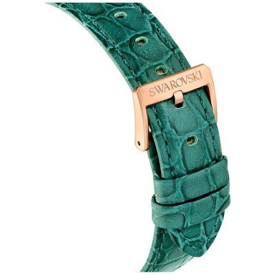 The Swarovski 5672931 Octea Chrono watch is a quartz chronograph with a 37mm round rose gold stainless steel case and a green dial. It is fitted with a green leather strap and buckle.