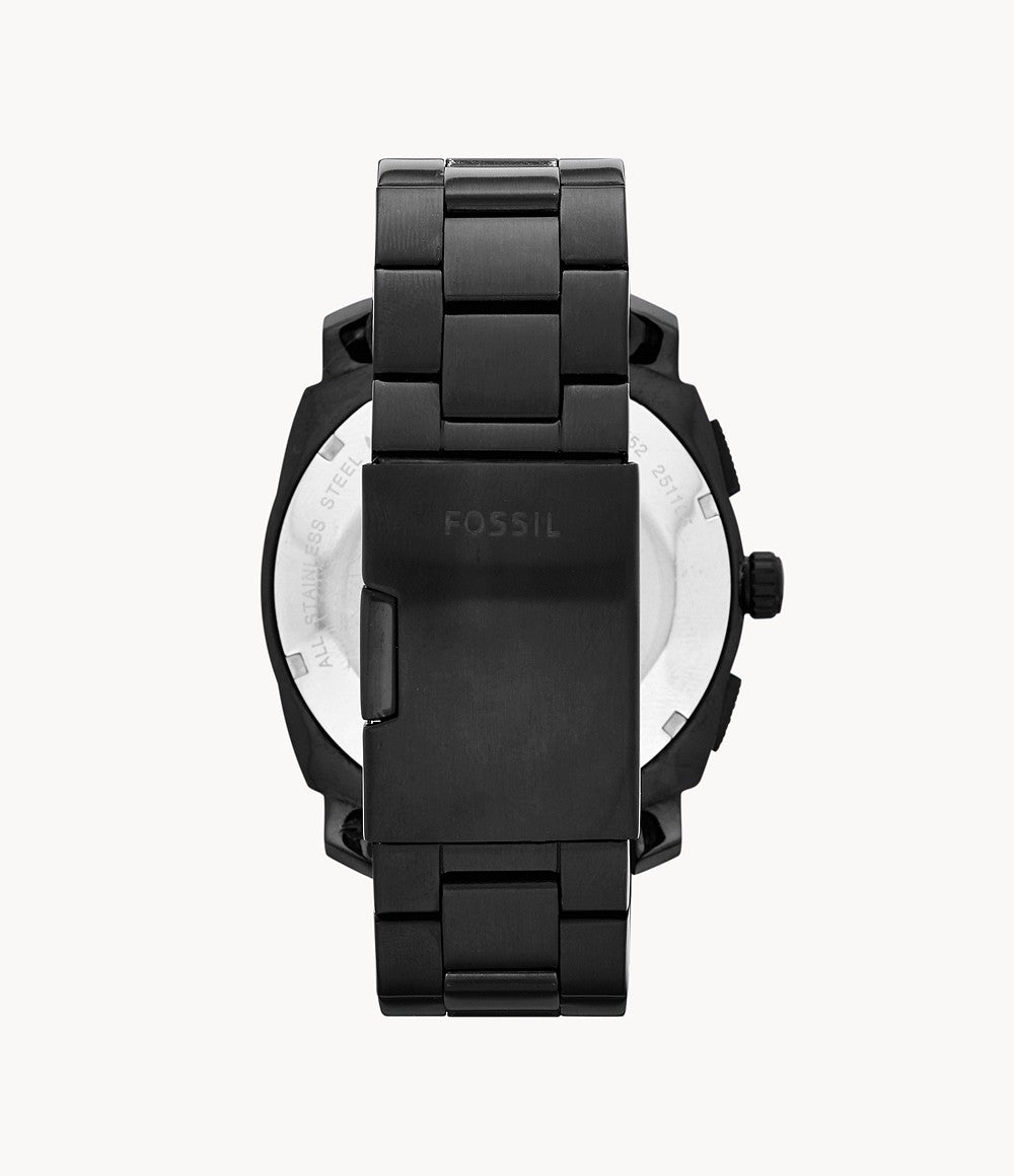 Caja y brazalete de acero inoxidable negro. Bisel fijo de acero inoxidable negro. Esfera negra con manecillas negras y marcadores de índice de hora. Marcadores de minutos alrededor del borde exterior. Tipo de esfera: analógica. Agujas y rotuladores luminiscentes. Visualización de la fecha entre las 4 y las 5 en punto. Cronógrafo: tres subesferas que muestran: 60 segundos, 60 minutos y 24 horas. Movimiento de cuarzo. Cristal mineral resistente a los arañazos. Tirar/empujar la corona. Parte trasera sólida. Forma de caja redonda, tamaño de caja: 45 mm, grosor de caja: 11 mm. Ancho de banda: 24 mm, longitud de banda: 8 pulgadas. Broche desplegable. Resistente al agua a 50 metros / 165 pies. Funciones: cronógrafo, fecha, hora, minuto, segundo. Serie de máquinas. Estilo de reloj informal. Fossil Machine Cronógrafo Cuarzo Esfera Negra Reloj para Hombre FS4552IE.