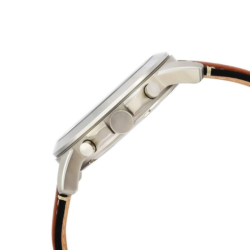 Caja de acero inoxidable con correa de piel marrón claro. Bisel fijo de acero inoxidable. Esfera azul marino con manecillas plateadas luminosas y marcadores de hora con números romanos. Marcadores de minutos alrededor del borde exterior. Tipo de esfera: analógica. Manos luminiscentes. Cronógrafo: tres subesferas que muestran: 60 segundos, 30 minutos y 24 horas. Movimiento de cuarzo. Cristal mineral resistente a los arañazos. Tirar/empujar la corona. Parte trasera sólida. Tamaño de la caja: 44 mm. Grosor de la caja: 12 mm. Forma de caja redonda. Ancho de banda: 22 mm. Cierre de espiga. Resistente al agua a 50 metros / 165 pies. Funciones: cronógrafo, hora, minuto, segundo. Estilo de reloj informal. Reloj Fossil Grant Cronógrafo Azul Marino Dial Hombre FS5210.