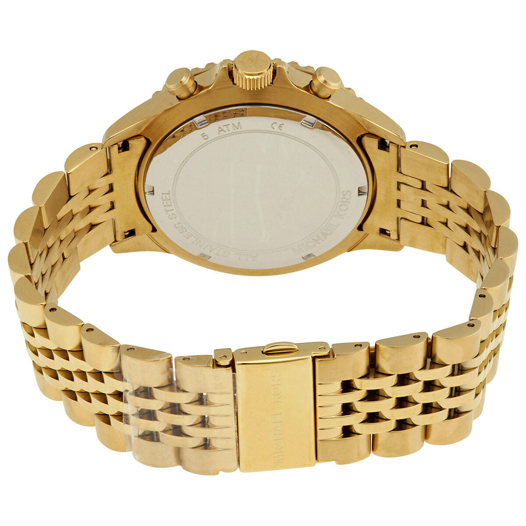 Caja y pulsera de acero inoxidable en tono oro amarillo. Bisel giratorio unidireccional en tono oro amarillo con anillo negro. Esfera negra con manecillas luminosas en tono dorado amarillo y marcadores de índice de hora. Marcadores de minutos alrededor del borde exterior. Tipo de esfera: analógica. Manos luminiscentes. Visualización de la fecha entre las posiciones de las 4 y las 5 en punto. Movimiento de cuarzo. Cristal mineral resistente a los arañazos. Parte trasera sólida. Forma de caja redonda. Tamaño de la caja: 44 mm. Grosor de la caja: 11 mm. Ancho de banda: 22 mm. Cierre plegable con cierre de seguridad. Resistente al agua a 50 metros / 165 pies. Funciones: cronógrafo, fecha, hora, minuto, segundo. Serie Bayville. Estilo de reloj informal. Michael Kors Bayville Reloj cronógrafo de cuarzo con esfera negra para hombre MK8726.