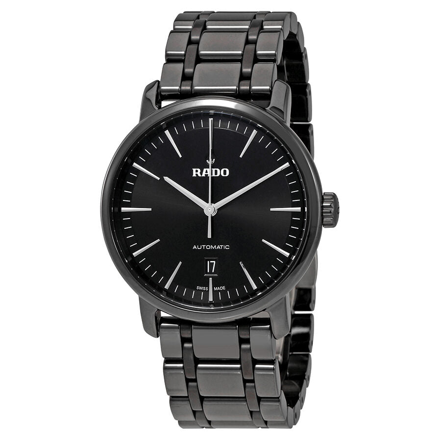 Black (high-tech) ceramic case and bracelet. Fixed black (high-tech) ceramic bezel. Black dial with silver-tone hands and index hour markers. Minute markers around the outer rim. Dial Type: Analog. Date display at the 6 o'clock position. ETA caliber 2892-A2 automatic movement, based upon ETA 2890, containing 21 Jewels, bitting at 28800 vph, and has a power reserve of approximately 42 hours. Scratch resistant sapphire crystal. Pull / push crown. Transparent case back. Round case shape. Case size: 41 mm. Case thickness: 10 mm. Band width: 20 mm. Fold over clasp with a push button release. Water resistant at 100 meters / 330 feet. Functions: date, hour, minute, second. Diamaster Series. Dress watch style. Watch label: Swiss Made. Rado DiaMaster XL Automatic Black Dial Men's Watch R14073182.